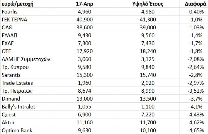 Το πλέον χαρακτηριστικό παράδειγμα αφορά τη μετοχή της Fourlis, η οποία την προηγούμενη εβδομάδα βρέθηκε στα 4,96 ευρώ, έχοντας ως κορυφή τα 4,98 ευρώ. Αυτό μεταφράζεται σε μια απόκλιση μόλις -0,4%, με την είσοδο του Ομίλου Φέσσα στο μετοχολόγιο της εισηγμένης να παρέχει αξιοσημείωτα καύσιμα. Παρόμοια είναι η εικόνα και στη μετοχή της ΓΕΚ ΤΕΡΝΑ, η οποία βλέπει τα υψηλά έτους να βρίσκονται στο -1% από την τρέχουσα τιμή (40,9 έναντι 41,3 ευρώ).