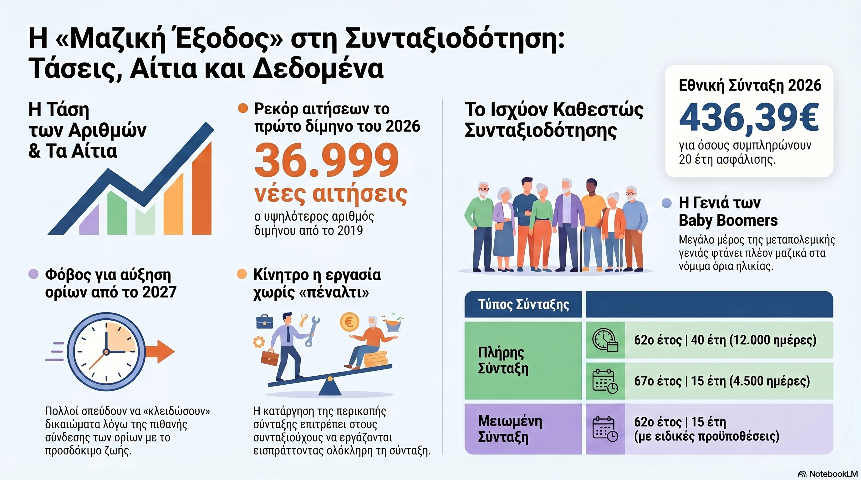 Το φαινόμενο του αυξημένου κύματος συνταξιοδοτήσεων πηγάζει από τον συνδυασμό δημογραφικών παραγόντων και αλλαγών στη νομοθεσία της κοινωνικής ασφάλισης.