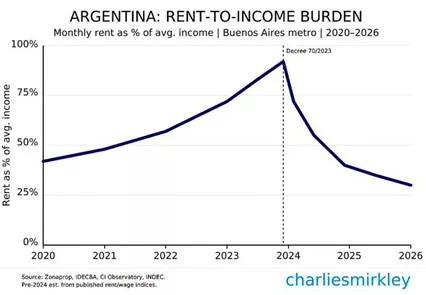 🏙️ Στο Μπουένος Άιρες, το κόστος ενοικίου ως ποσοστό του μέσου εισοδήματος μειώθηκε θεαματικά από περίπου 90% στις αρχές του 2024 σε περίπου 30% το 2026, σύμφωνα με το διάγραμμα. Η εξέλιξη αυτή αποδίδεται στις μεταρρυθμίσεις της κυβέρνησης Χαβιέρ Μιλέι μετά το Διάταγμα 70/2023.
