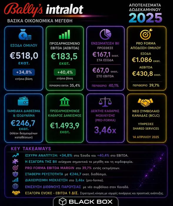 🧩 Η εξαγορά της Bally’s International Interactive συνιστά τομή για τον όμιλο, αφού τον μετατρέπει από πάροχο τεχνολογίας και υποδομών σε ενεργό συμμετέχοντα στην τελική κατανάλωση. Αυτό αυξάνει τις δυνατότητες κερδοφορίας, ενισχύει τα περιθώρια και προσδίδει πιο άμεση έκθεση σε αγορές με υψηλότερη δυναμική.