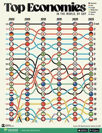 🌐 Ο παγκόσμιος οικονομικός χάρτης αλλάζει συνεχώς. Οι ΗΠΑ παραμένουν πρώτη δύναμη σε ΑΕΠ, διατηρώντας καθαρό προβάδισμα. 💹 Η Κίνα εδραιώνεται στη δεύτερη θέση, επιβεβαιώνοντας τη μακροχρόνια άνοδό της. Η Γερμανία ανεβαίνει τρίτη, ξεπερνώντας την Ιαπωνία, που υποχωρεί τέταρτη λόγω χαμηλής ανάπτυξης και δημογραφικής πίεσης. Η Ινδία ανεβαίνει πέμπτη, δείχνοντας το τεράστιο δυναμικό της. Η Βρετανία και η Γαλλία υποχωρούν σχετικώς, ενώ χώρες όπως η Σαουδική Αραβία, η Ινδονησία και η Πολωνία κερδίζουν έδαφος. Το μήνυμα είναι σαφές: η οικονομική ισχύς μετακινείται προς Ασία και αναδυόμενες αγορές.