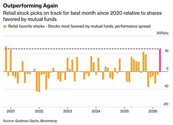🟠 Η «μαρίδα» (retail investors) ηγούνται ξανά του ράλι της Wall Street, με τις αγαπημένες τους μετοχές να υπεραποδίδουν κατά 11 ποσοστιαίες μονάδες έναντι των τίτλων που προτιμούν τα αμοιβαία κεφάλαια μέσα στον Απρίλιο.