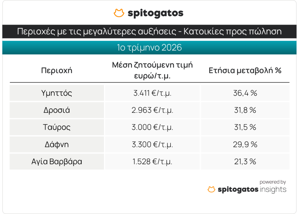 Οι περιοχές που ξεχώρισαν κατά το 1ο τρίμηνο του 2026 για τις σημαντικές αυξήσεις που σημείωσαν στη ΜΖΤ πώλησης κατοικίας σε σχέση με το αντίστοιχο τρίμηνο του 2025 είναι η περιοχή του Υμηττού, ενώ ακολουθούν η Δροσιά, ο Ταύρος, η Δάφνη και η Αγία Βαρβάρα.