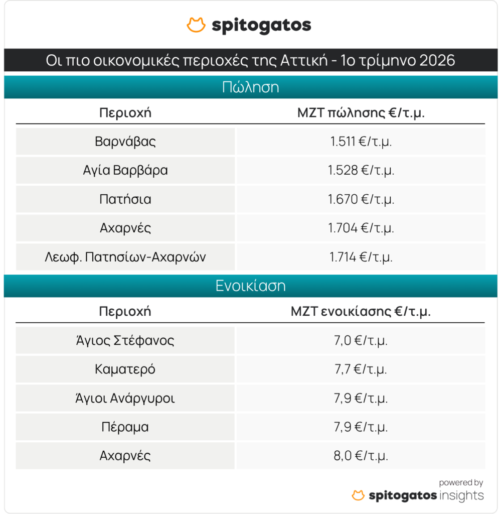 Στις πιο οικονομικές περιοχές της Αττικής για αγορά κατοικίας βρίσκεται ο Βαρνάβας με ΜΖΤ πώλησης στα 1.511 ευρώ/τ.μ., ενώ ακολουθούν η Αγία Βαρβάρα, τα Πατήσια, οι Αχαρνές και η περιοχή Λεωφόρος Πατησίων-Αχαρνών.