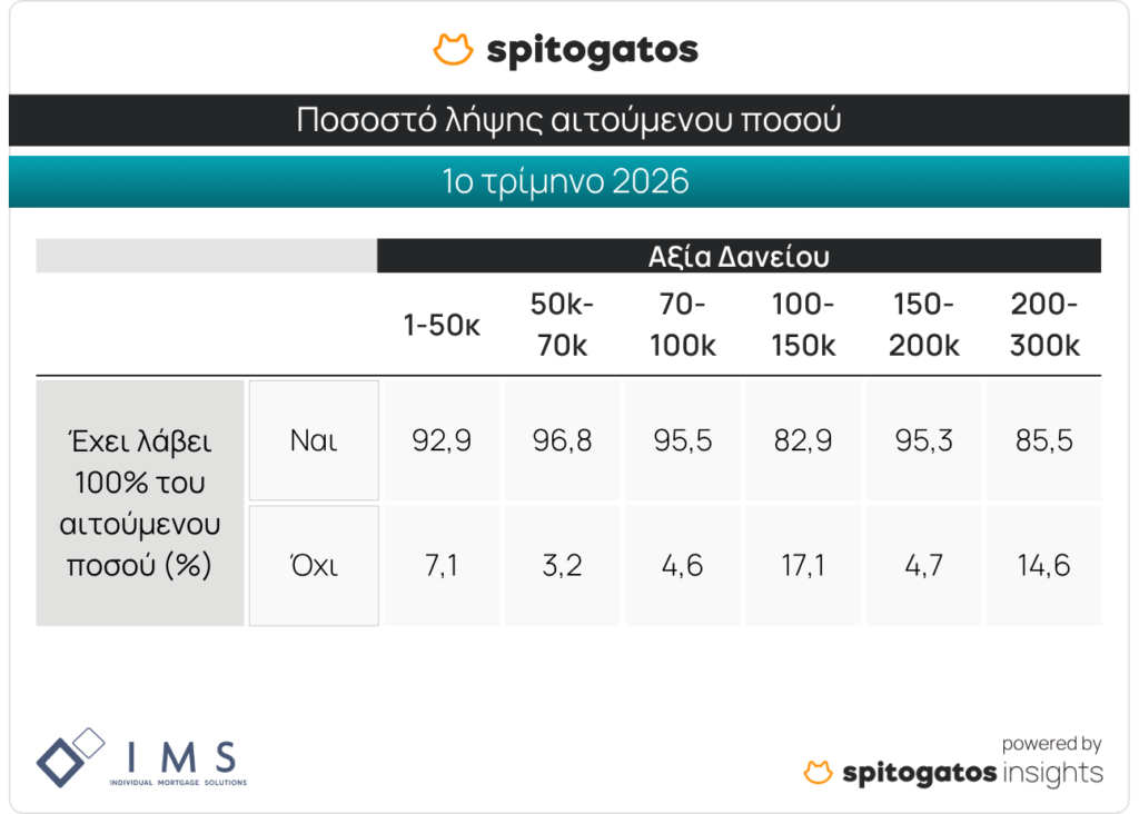 Εξετάζοντας περαιτέρω τα στοιχεία του 1ου τριμήνου του 2026, αποτυπώνεται μια συνολικά ισχυρή εικόνα έγκρισης στεγαστικών δανείων στην ελληνική αγορά ακινήτων, καθώς η μεγάλη πλειονότητα των δανειοληπτών έλαβε το 100% του αιτούμενου ποσού στις περισσότερες κατηγορίες δανείου.