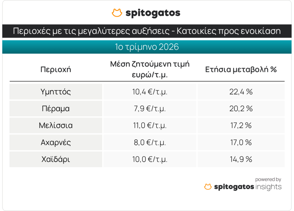 Στο κομμάτι της ενοικίασης, οι περιοχές που αναδεικνύονται με ετήσιες αυξήσεις ηπιότερες σε σχέση με την πώληση, είναι: ο Υμηττός, το Πέραμα, τα Μελίσσια, οι Αχαρνές και το Χαϊδάρι.