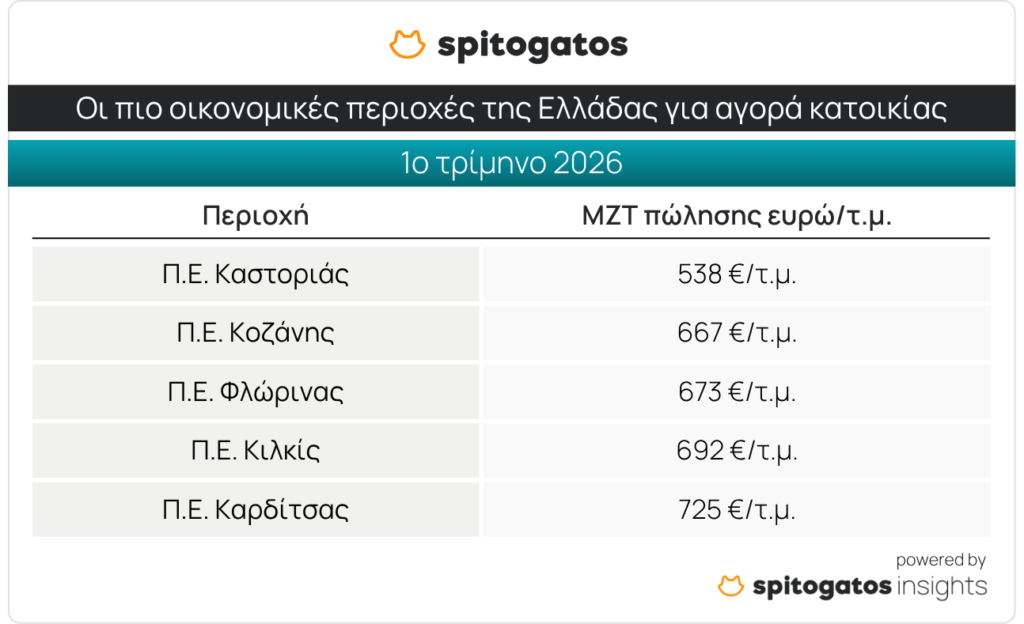 Στον αντίποδα, οι πιο οικονομικές περιοχές της χώρας για αγορά κατοικίας είναι οι εξής: η Π.Ε. Καστοριάς με ΜΖΤ πώλησης στα 538 ευρώ/τ.μ., η Π.Ε. Κοζάνης, η Π.Ε. Φλώρινας, η Π.Ε. Κιλκίς και η Π.Ε. Καρδίτσας.