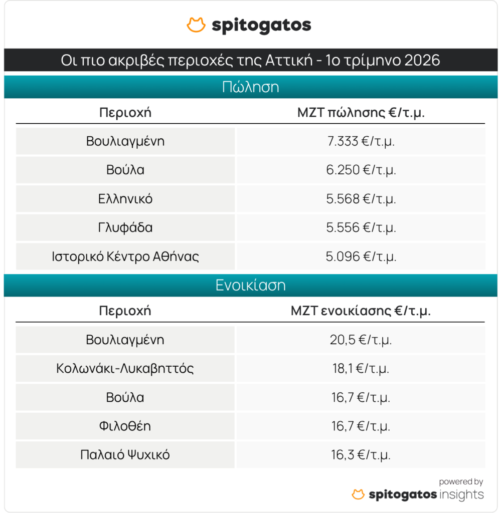 Το Spitogatos Insights εξέτασε την εξέλιξη των ΜΖΤ πώλησης και ενοικίασης κατοικιών στην Αττική κατά το 1ο τρίμηνο του 2026. Σύμφωνα με τα πρόσφατα στοιχεία, τα Νότια Προάστια σχεδόν μονοπωλούν το top 5 των πιο ακριβών περιοχών της Αττικής, με τη Βουλιαγμένη να βρίσκεται στην κορυφή με ΜΖΤ 7.333 ευρώ/τ.μ., ενώ ακολουθούν η Βούλα, το Ελληνικό, η Γλυφάδα και το Ιστορικό Κέντρο της Αθήνας, όπως φαίνεται στον παρακάτω πίνακα.