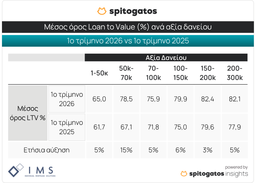Είναι σημαντικό να σημειωθεί ότι ο δείκτης LTV είναι αυξημένος κατά το 1ο τρίμηνο του 2026 σε όλες τις βαθμίδες αξίας δανείου, με τη σημαντικότερη αύξηση να σημειώνεται στη βαθμίδα 50-70 χιλιάδες ευρώ.