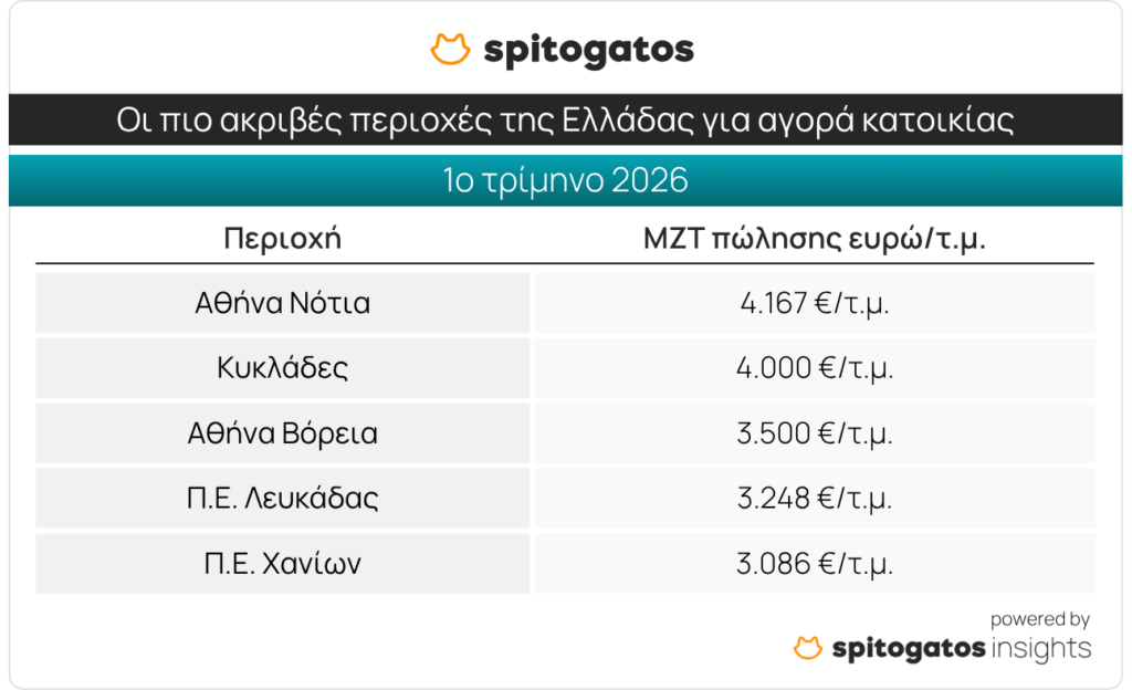 Τα Νότια Προάστια και οι Κυκλάδες συνεχίζουν να καταλαμβάνουν τις πρώτες θέσεις στην κατάταξη των πιο ακριβών περιοχών της χώρας για αγορά κατοικίας, με ΜΖΤ πώλησης κατοικίας 4.167 ευρώ/τ.μ. και 4.000 ευρώ/τ.μ. αντίστοιχα, ενώ ακολουθούν τα Βόρεια Προάστια, η Περιφερειακή Ενότητα (Π.Ε.) Λευκάδας και η Π.Ε. Χανίων.