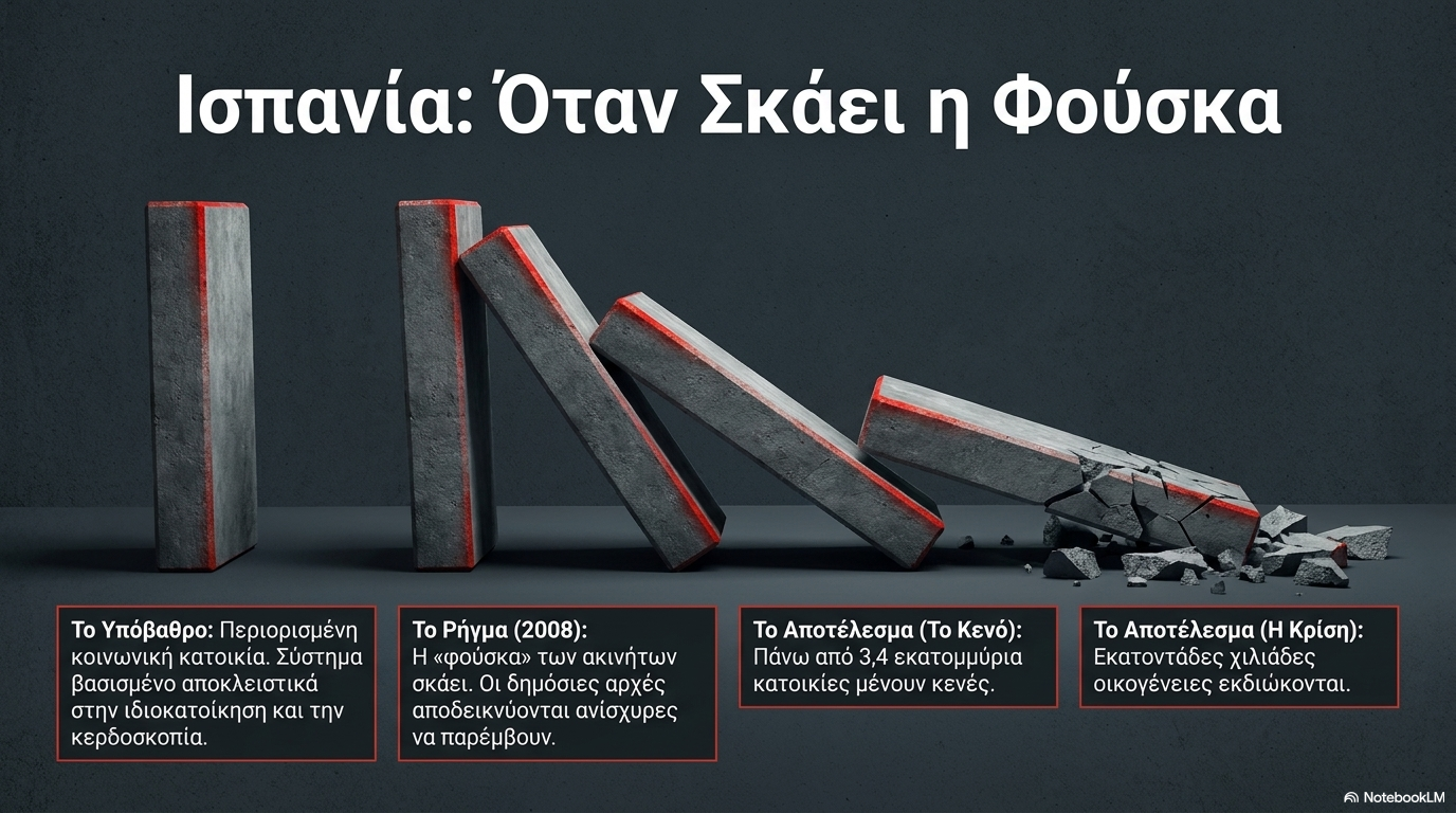 Το στεγαστικό σύστημα της Ισπανίας, γράφει το theconversation, βασίζεται εδώ και καιρό σε μεγάλο βαθμό στην ιδιοκατοίκηση. Ο περιορισμένος αριθμός κοινωνικών κατοικιών αφήνει στις δημόσιες αρχές περιορισμένη δυνατότητα παρέμβασης έναντι των αυξήσεων των τιμών. Όταν η «φούσκα» των ακινήτων στη χώρα της Ιβηρικής έσκασε το 2008, αποκαλύφθηκε ένα στεγαστικό σύστημα που βασιζόταν στην κερδοσκοπία και όχι στη σταθερότητα. Πάνω από 3,4 εκατομμύρια κατοικίες έμειναν κενές και εκατοντάδες χιλιάδες οικογένειες εκδιώχθηκαν.