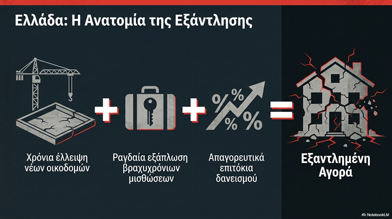 Στην Ελλάδα το φαινόμενο τροφοδοτείται από έναν «εκρηκτικό» συνδυασμό παραγόντων: τη χρόνια έλλειψη νέων οικοδομών, τη ραγδαία εξάπλωση των βραχυχρόνιων μισθώσεων που απορροφούν το διαθέσιμο απόθεμα και την αύξηση των επιτοκίων που καθιστά τον δανεισμό απαγορευτικό για τη μέση οικογένεια.